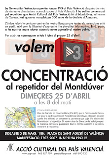 La data triada pel Govern valencià per a començar el tancament de repetidors és el 25 d'abril, una data molt simbòlica per a totes les valencianes i valencians. Així que ACPV ha organitzat una concentració pacífica per a eixe dia (dimecres que ve), a les 8 del matí, al repetidor del Montdúver, a la Safor, per impedir que es faça efectiva la clausura, prevista per a les 9.00 hores. Des del Casal de Gata d'ACPV animem a tots aquells que puguen anar-hi que donen suport en un moment tan important per a la nostra llengua i cultura.